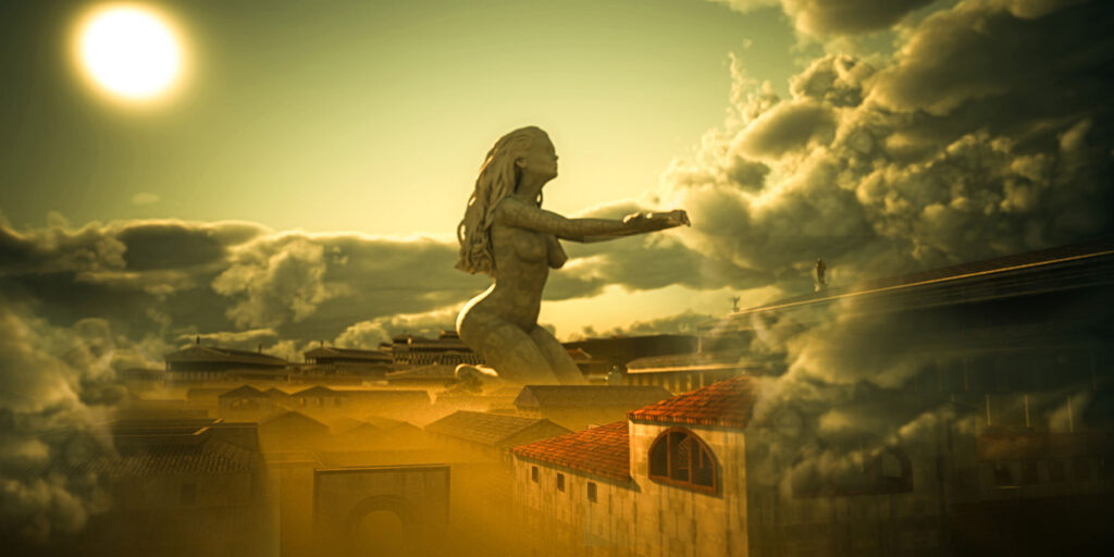 Then arose Barak-thura, a warlord of terrible might, who claimed his father’s throne by right of combat. By slaying his own sire in an honorable duel, he claimed the exalted title of To-kru Pekra (Great Warrior). Gathering a host unnumbered, he marched upon Amja-la, the great capital. Yet, the city was not taken by fire or siege. Mji-la, the fair and wise princess of the Gamyu-na, saw that even the greatest walls must eventually fall. Knowing the brutal laws of the barbarians, she listened to the whispers of the gods, who revealed the only salvation for the city and its citizens. Stripping herself of all pride, raiment, and jewels, she walked forth naked to meet the warlord. Before his gathered host, she knelt and offered him a collar of submission, surrendering herself and her people to bondage that they might be spared.